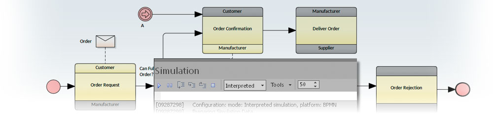 Model Simulation in Enterprise Architect provides a suite of tools to simulate the execution and behavior of the processes that your models define. The tools provide facilities to dynamically simulate a range of types of model, and include specialized tools for: