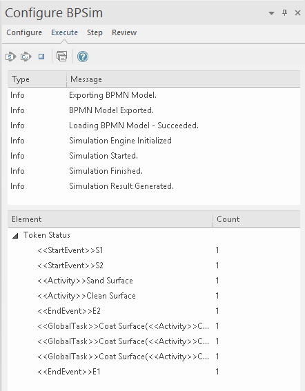 For the only token started on S1, we can see from the Configure BPSim window 'Execute' tab how the flow develops:
