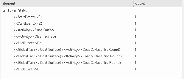 - When reaching a callGlobalTaskActivity, the called Global Task is activated - the notation reads: GlobalTask name (called activity name); the global Coat Surface was called three times: