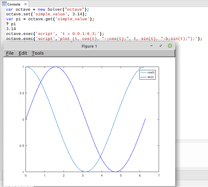 This illustration shows some examples of using the Octave Solver's Set, Get and Exec, as well as the output using ?, in the Octave Console: