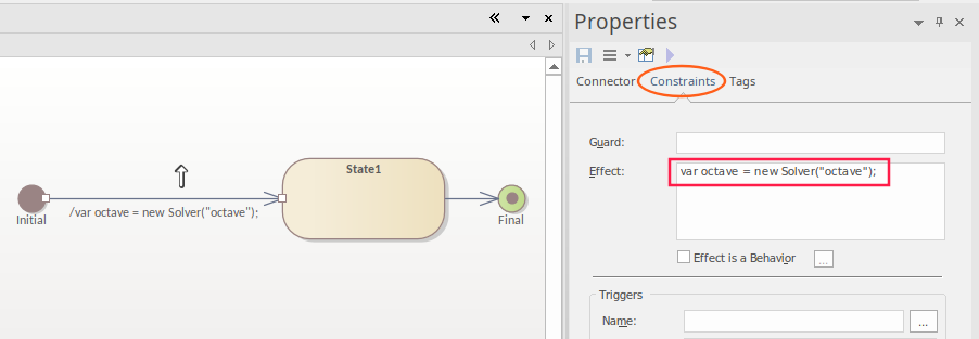 The script to initialize a Solver in a StateMachine can be placed either in the Effect of a Transition or in the Entry operation of a State. It is usually placed in the Effect of the first Transition exiting the Initial.