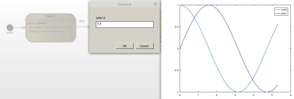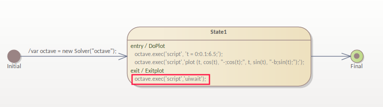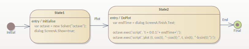 The script to run the plot will be in the Entry operation of State2. During the simulation the transition into State2 will only occur after the Win32 OK button is clicked and the Plot trigger is sent. So we now: