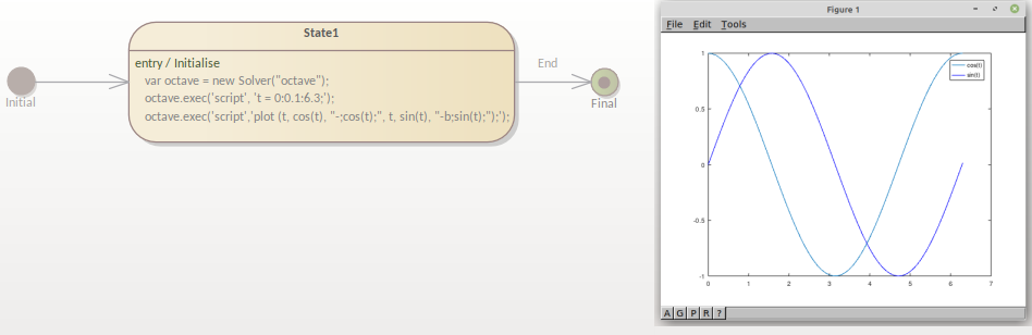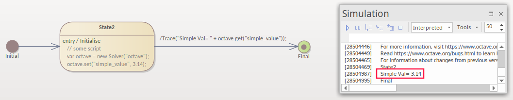 This topic provides some simple examples of where and how to apply Solvers in StateMachine Simulations, which includes using scripts in StateMachine operations as well as in Transition connectors. The images in this topic show Octave Solver examples; however, unless otherwise stated, the same script can be used for MATLAB in the MATLAB Solver.