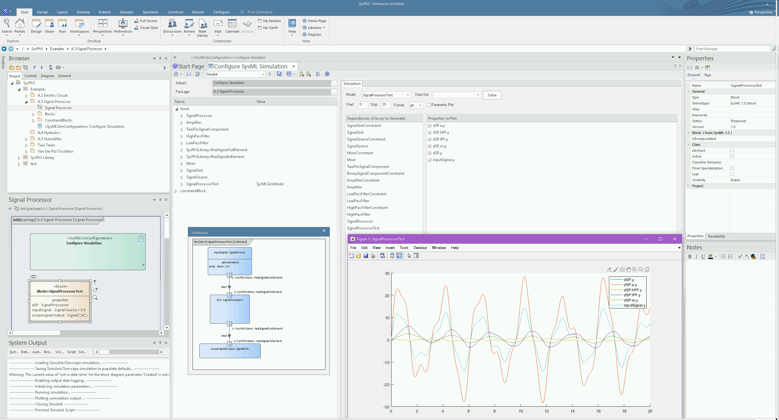 Enterprise Architect will translate a SysML model into the Simulink format and automatically run the simulation, plotting the outputs of the selected variables. The generated Simulink file can also be opened directly in Simulink, allowing modification and fine-tuning of the simulation settings and output functionality.
