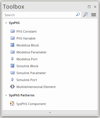 The SysPhS profile provides a dedicated Toolbox page, containing basic SysML elements for both OpenModelica and MATLAB Simulink and, on a 'SysPhS Patterns' page, the 'SysPhS Component' icon.
