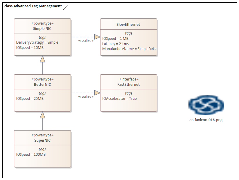 This diagram illustrates a complex tag hierarchy and the way Tagged Values can be either inherited or overridden in specialized Classes to create the final tagged property set for an element. A similar concept applies to instances, where the full tag set is created from the directly owned tags, plus all of those merged in from the classifier's type hierarchy, additional stereotypes and realized interfaces.