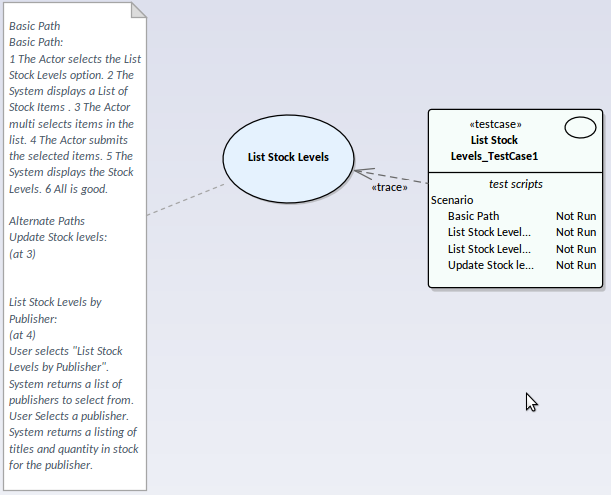 A Test Case element is created, linked to the selected element using the Trace connector. A diagram is created under this Test Case element, to which the selected element, the Test Case element and a Note (showing the element's scenario specification) is added. The created tests are displayed in the Test Scripts compartment of the Test Case element on the diagram. A test case is generated and added to the Test Case element for the basic path, and for each alternate and exception path. In addition, for each step in the basic, alternate and exception paths that has a value in the 'Results' column, a test is generated and added to the Test Case element. You can review the tests within the Test Case element using the Testing window, as for Internal Test Cases.