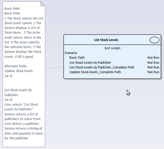 A test is generated for the basic path and each alternate and exception path in the scenario, and added to the selected element. In addition, for each step in the basic, alternate and exception paths that has a value in the 'Results' column, a test is generated and added to the selected element. A diagram is created under the selected element, to which that element and a Note (showing the element's scenario specification) is added. The created tests are displayed in the Test Scripts compartment of the selected element on the diagram. Another way to view these tests is to click on the element and display the Testing window. These generated tests are written to the Scenario Class Type of the Testing window; you can change the tests to another test-type if required.