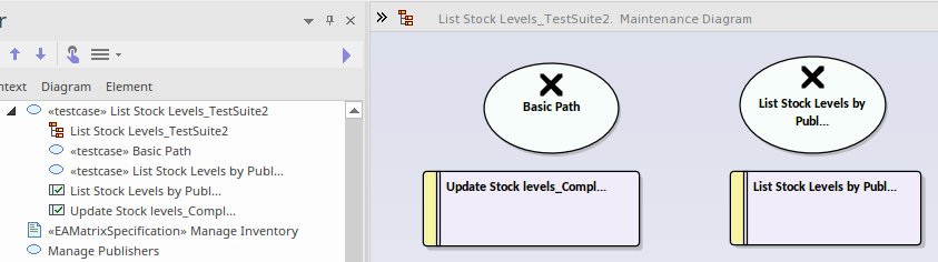 A Test Case element is created, which acts as a container for the created diagram and Test Suite elements. The basic path and each alternate and exception path is represented using a Test Case element. Each step in the basic, alternate and exception paths is represented by a Test element. A diagram is created under the container Test Case element, to which the Test Case and Test elements are added. The elements are displayed on the diagram in a single column with the basic path and its steps at the top followed by each alternate and/or exception path and its steps.