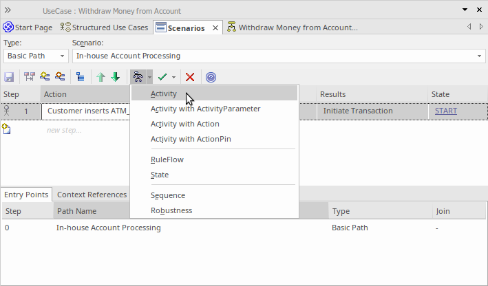 Browser window > Element | Scenarios | New Scenario > Scenario View Browser window > Element > Scenarios | right-click on existing scenario | Structured Scenario Editor |