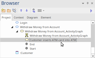 On a diagram or in the Browser window, click on the element and select one of these access methods to display the Scenarios view, then click on