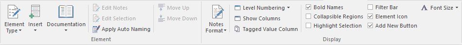 The 'Element' panel offers a range of facilities for working with the elements that are displayed in the Specification Manager view. There are facilities for adding new elements and viewing and editing element properties.
