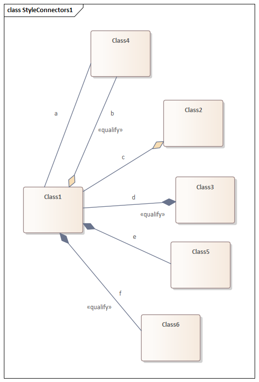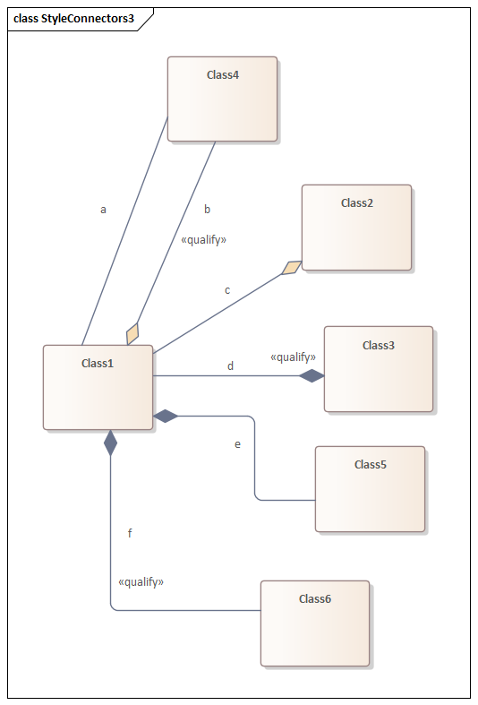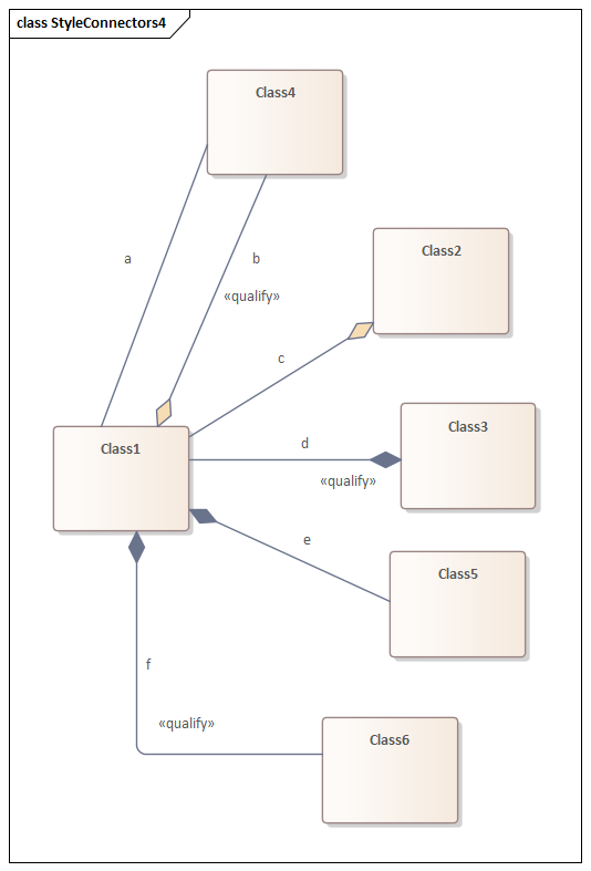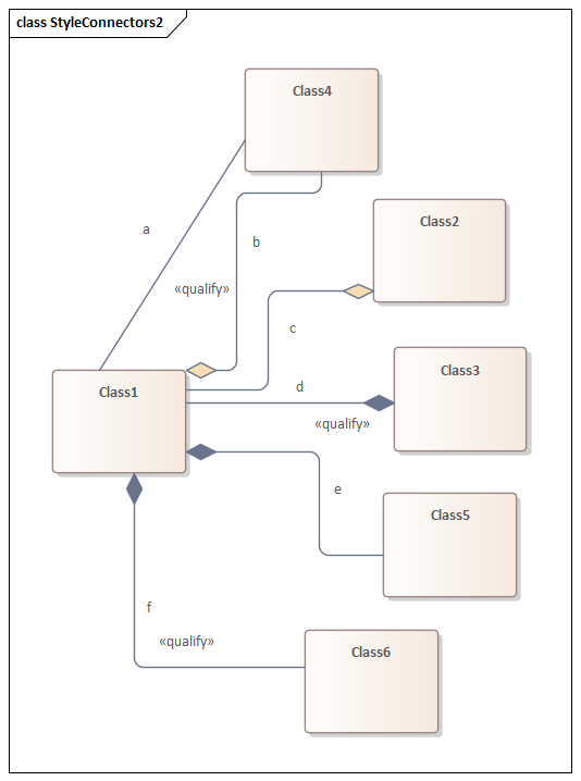 OR, if you right-click on connector d and select the 'Apply Line Style on Diagram | Connectors of the same SubType' option, you should see these changes to the connectors (only connectors e and f change because only those two are the same type and subtype as d, being strong Aggregations):