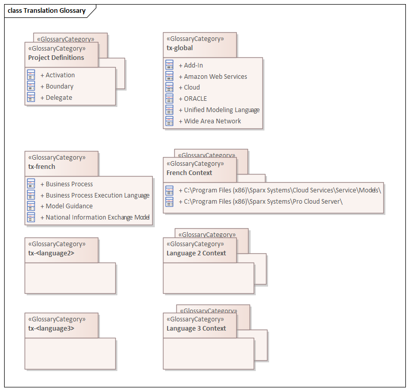 The Glossary diagram for translations will contain GlossaryCategory elements for the global translation process, for each language your project team will translate text into, and at least one 'special case' where words in one context must be translated differently from the same words in a different context. You therefore need to plan what categories you require, especially the types of special case you might need to prepare for. For each language translation Package, give the Package the name tx-<language>; for example, tx-french. An overall Glossary model content, as it is being developed, might resemble this example: