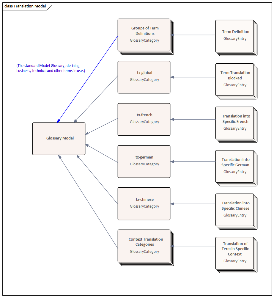 A Translation Glossary model is a variant of your overall Glossary model. If you are not yet familiar with the structure of a Glossary model, see the Create a Glossary as a Package Structure Help topic.