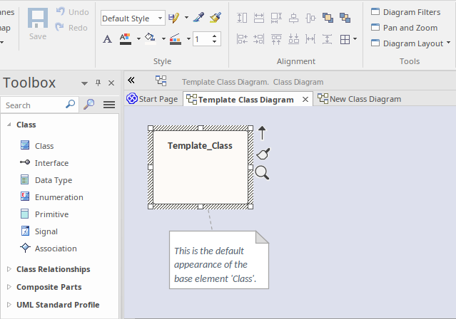 In the next image, the appearance of the element 'Template_Class' on the diagram 'Template Class Diagram' has been updated, using the tools from the Style panel of the Layout ribbon. Note however, that the default appearance of the element 'Template_Class' remains unchanged.