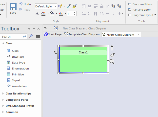 Similarly, if 'Class1' was deleted from 'New Class Diagram' (but not from the model) and then dropped back onto the diagram from the Browser window, it would be created using the default appearance copied from Template_Class, not the appearance displayed on the template diagram.