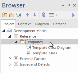 Locate and click on the Package you wish to set as the Templates Package, then click on the . (You can set only one Package at a time as the Templates Package.) Now each new element or diagram you add to your project is created with the settings from the appropriate template element or diagram. |
