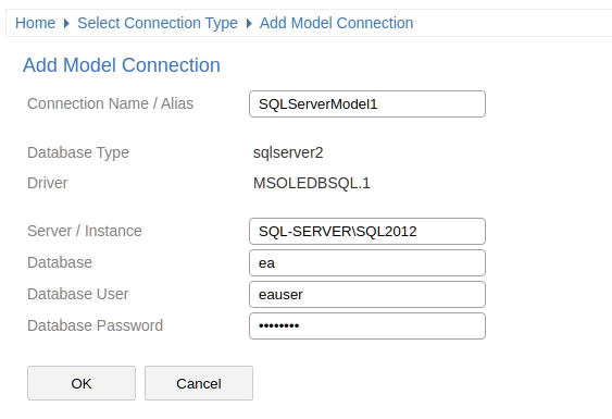 ![]() Connection Name / Alias Specify a short, unique name for the connection. This is required when accessing the model via Enterprise Architect or WebEA. Server / Instance Enter the Server Name or Server Instance; for example: 'SQL-SERVER' or 'SQL-SERVER\SQL2012'. Database Enter the database name of the Enterprise Architect repository. User Enter the user name. Password Enter the password for the specified user. |