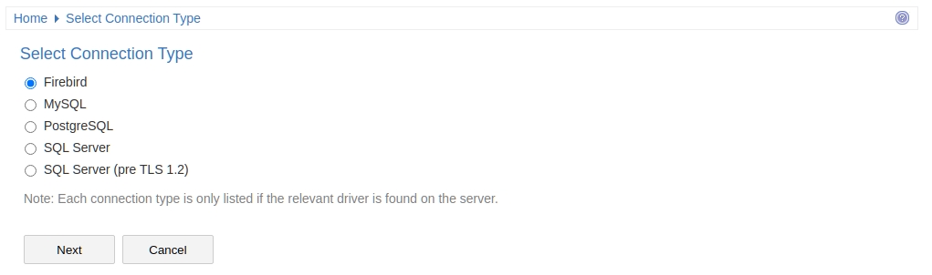 The WebConfig supports the creation of Firebird, Oracle (OLE DB) or SQL Server (OLE DB) Model Connections. Select the relevant radio button for the connection type, depending on the type of database you are accessing.