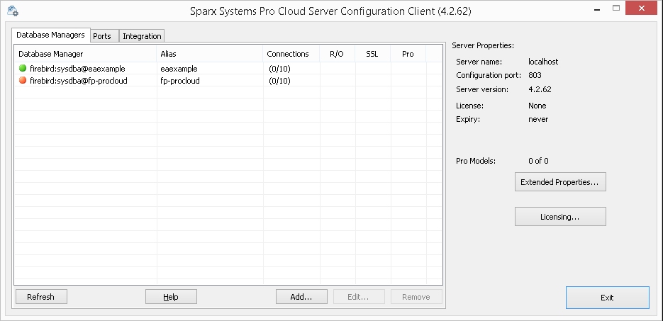 This screen shows a list of all defined database managers and the details of the connected Pro Cloud Server. It is also the entry point for all management functions, such as configuring your License, setting the ports the Pro Cloud Server listens on, and maintaining database connections.