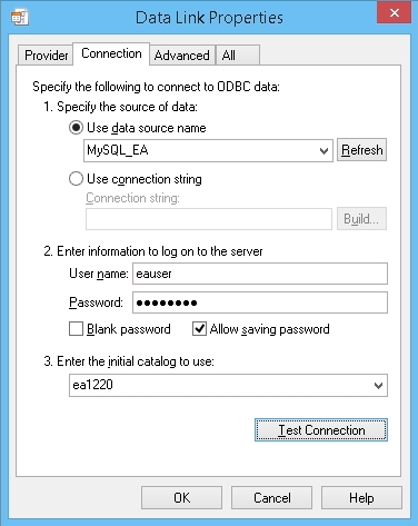 When user credentials have not been saved within the System DSN, the 'Data Link Properties' dialog should be filled in like this: