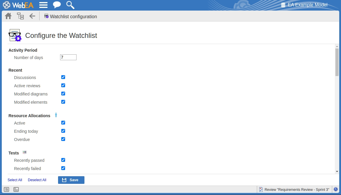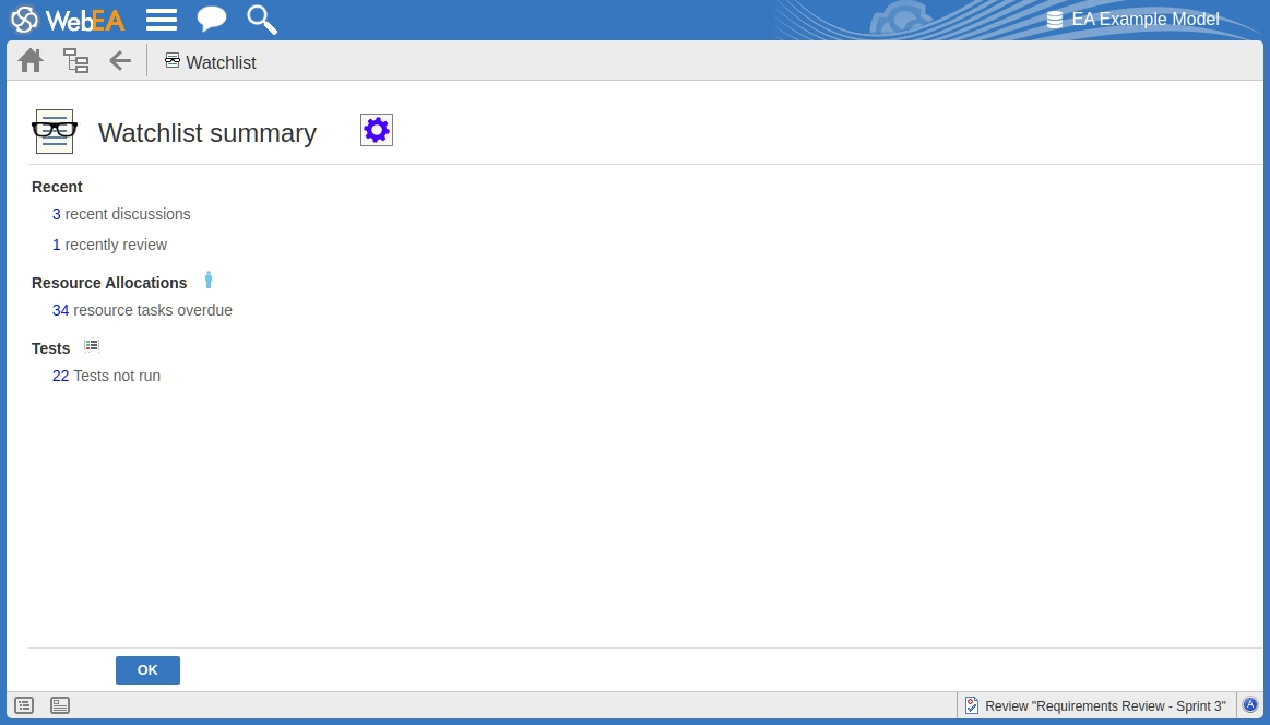 The Watchlist facility in WebEA helps you to quickly identify recent activity in the model. Each user can tailor their Watchlist to monitor activity in any of a wide range of objects and features with various characteristics. Whenever the Watchlist Summary is generated, all object types of interest are checked for recent activity and a count of matched objects displayed. All matched object counts can be clicked on to display the list of objects that match the particular activity type.