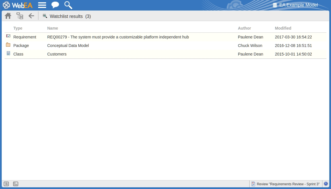 The 'Watchlist results' page is the same as the custom search results page, in that if you then click or tap on an individual item in the list, the 'Properties' view will be displayed for the selected object. See the WebEA's Layout Help topic.