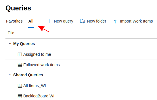 - To view all queries which will be accessible to the DevOps integration click on 'All'. The Queries will be grouped into 'My Queries' and 'Shared Queries'.