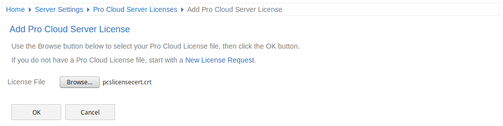 On the Pro Cloud Server Licenses screen, click on the Add License button. The 'Add Pro Cloud Server License' screen is then displayed.