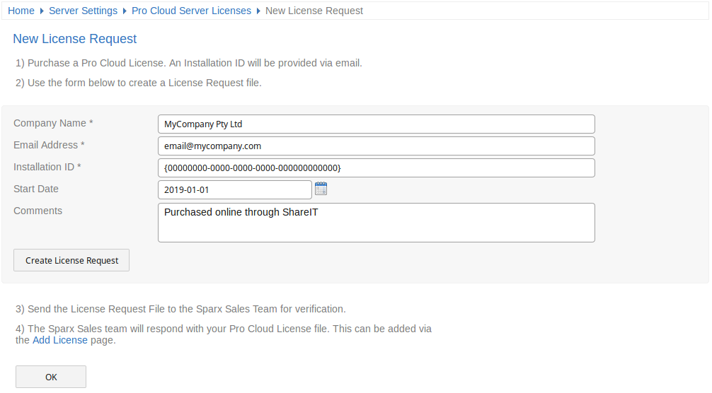 Fill in the details of your company and the Pro Cloud Server purchase (refer to the New License Request Form table for more information), for example: