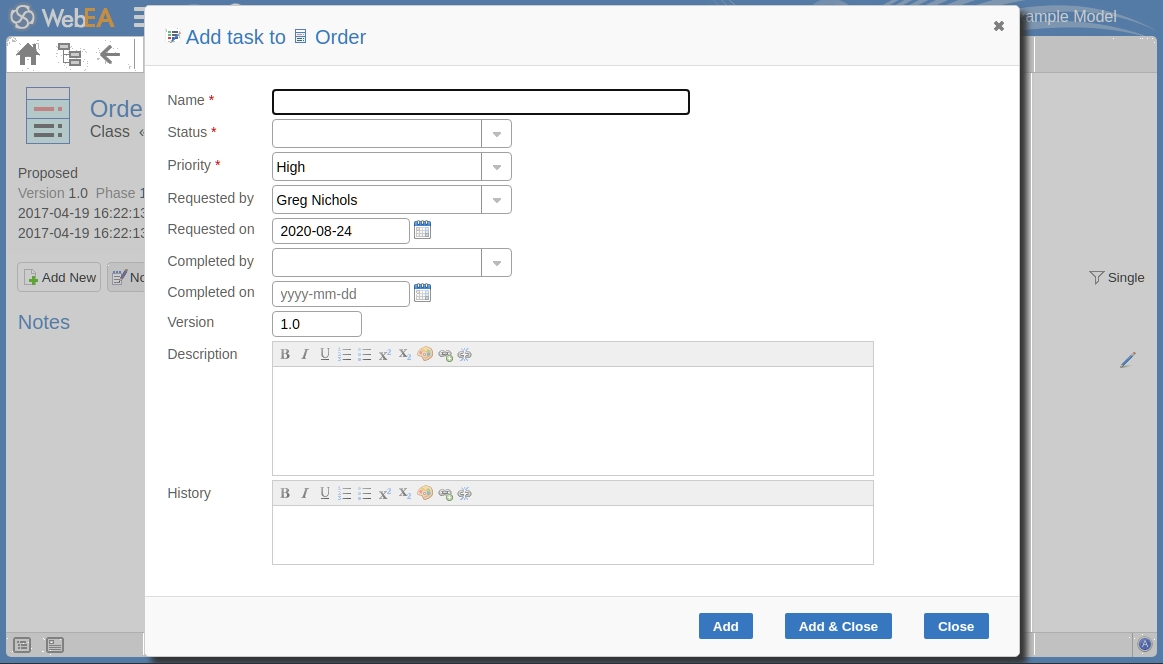 Display the properties of the element to which you want to add the task record, and click on the 'Add New' button. A menu displays offering options to add various features to the element. Select the 'Add task' option. The 'Add task to <element name>' dialog displays.