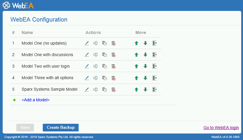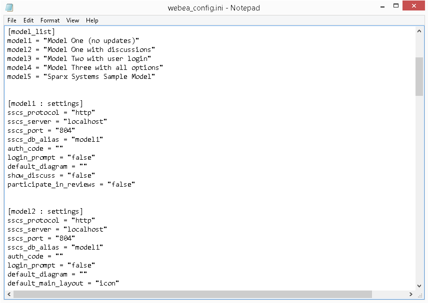 This configuration file defines the model connections that are available on WebEA's login page. For each WebEA model connection you define how WebEA will access the model (which server, which Port and so on), and optionally apply settings to adjust WebEA's functionality  (such as showing or hiding specific features).