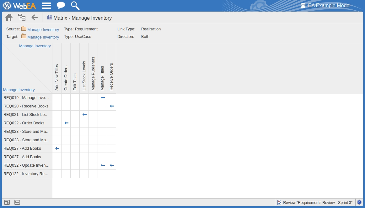 - If a relationship exists between a source and target element, displaying an arrow indicating the direction of the relationship, at the intersection of the appropriate row and column