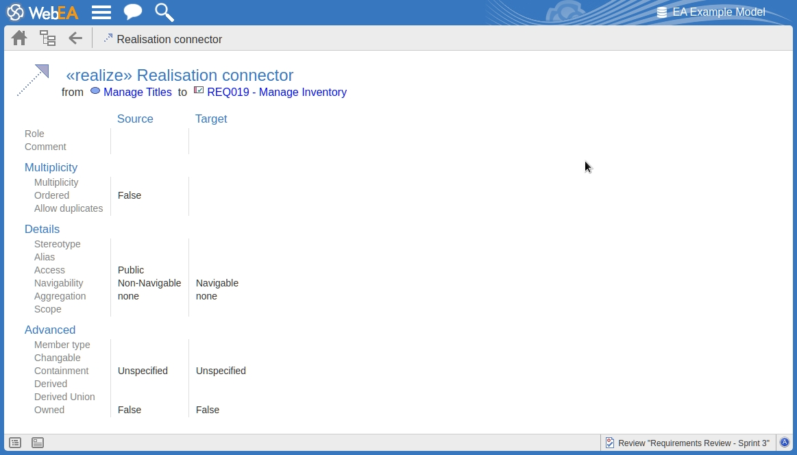 Clicking on a square containing an arrow displays the 'Relationship Properties' screen for the relationship represented by that arrow. On that screen you can click on the source or target element names and display the 'Element Properties' screen for those elements.