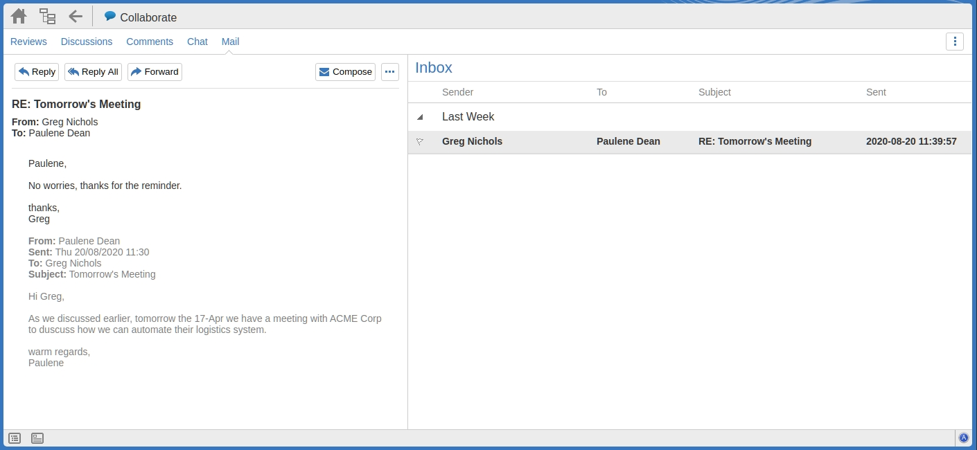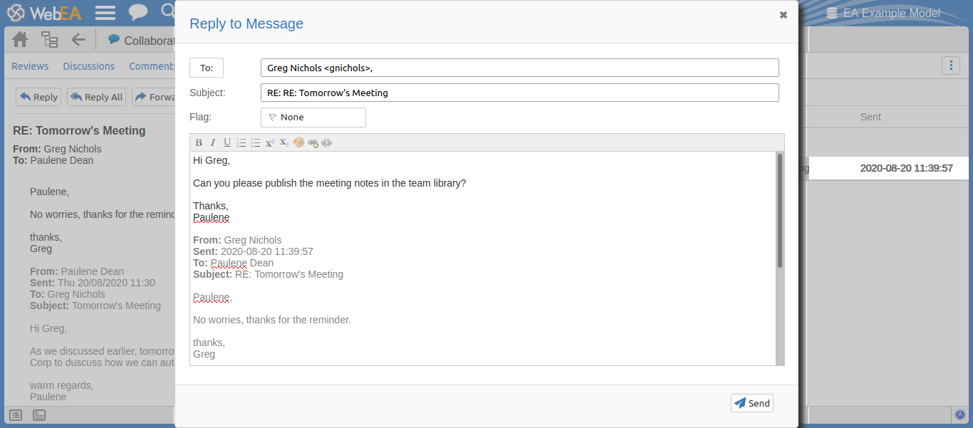 Enterprise Architect's internal Model Mail system can be accessed within WebEA, allowing you to view and send messages from your web browser.