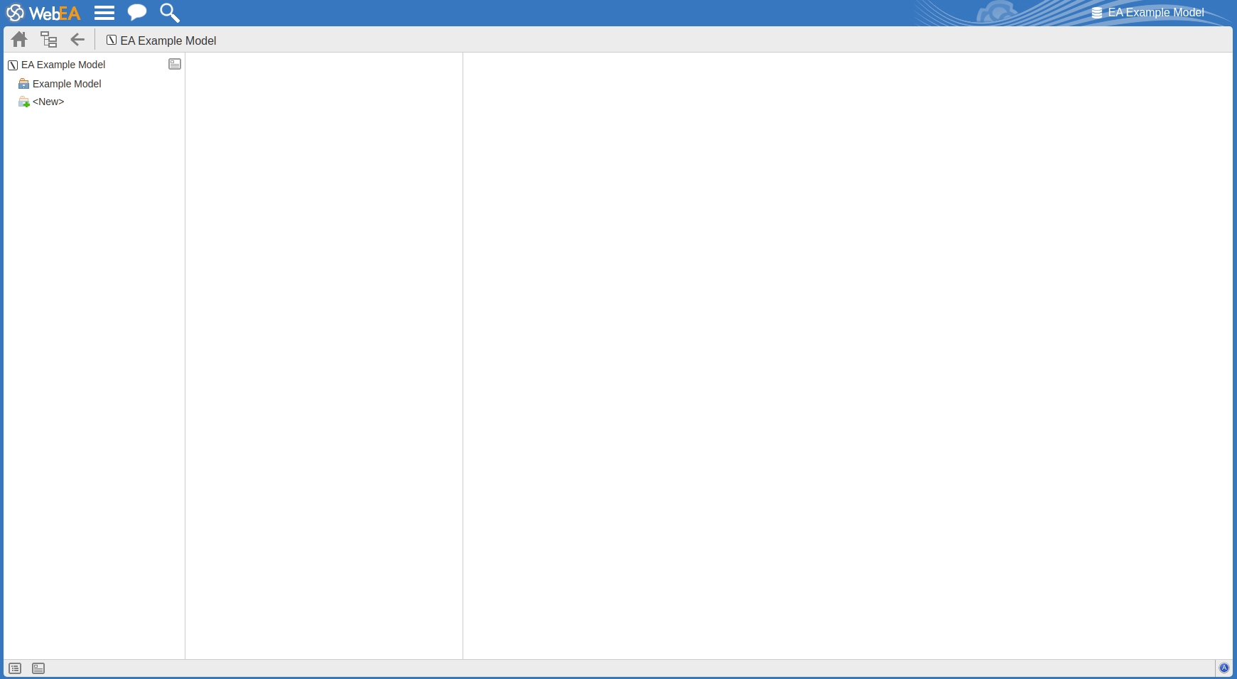 This image shows the WebEA screen after loading the example model, when no default diagram has been configured.