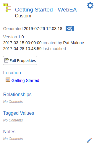 The WebEA Properties View displays a context sensitive view of a diagram, package or element's properties. It can be toggled on or off via the 'Properties' button which is located in the status bar at the bottom of WebEA, and also in the top right corner for the Browser (when it is displayed).