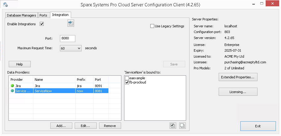 On the 'Integration' tab of the Pro Cloud Server Configuration Client window, you will now see: