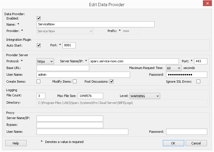 - You can leave other fields blank or set to their default values. Click on the to complete the configuration. This returns you to the 'Integration' tab of the Pro Cloud Server Configuration Client window.