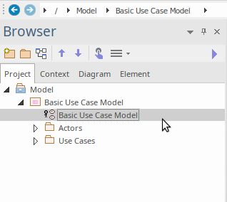 In this diagram you can see several Actors and Use Cases. If you click on one of the Actors and then press , or right-click and choose 'Find | In Project Browser' from the context menu, the 'Actors' Package is expanded and the element selected in the diagram will be selected in the Browser window, as shown here.