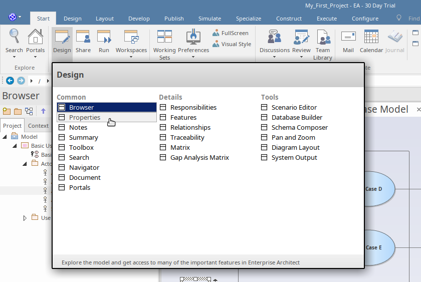 There are many property windows in Enterprise Architect, and for this walk-through we will look at a few of the most important. There are many shortcuts and keystrokes to bring up different property sheets, but for now it is simplest to access them from the main Ribbon: