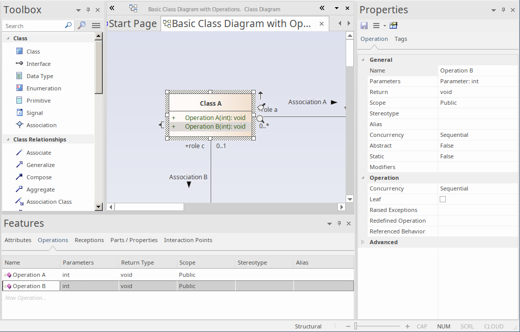Now click on Class A in the diagram (or in the 'Project' tab of the Browser window). You will notice that as soon as Class A is selected, the details of its operations are displayed in the Features window. Here you can modify an existing operation, by changing its name, its return type or even its parameter list. When you select an operation in this list, the Properties window switches to Operation Properties, and displays details of the selected operation.