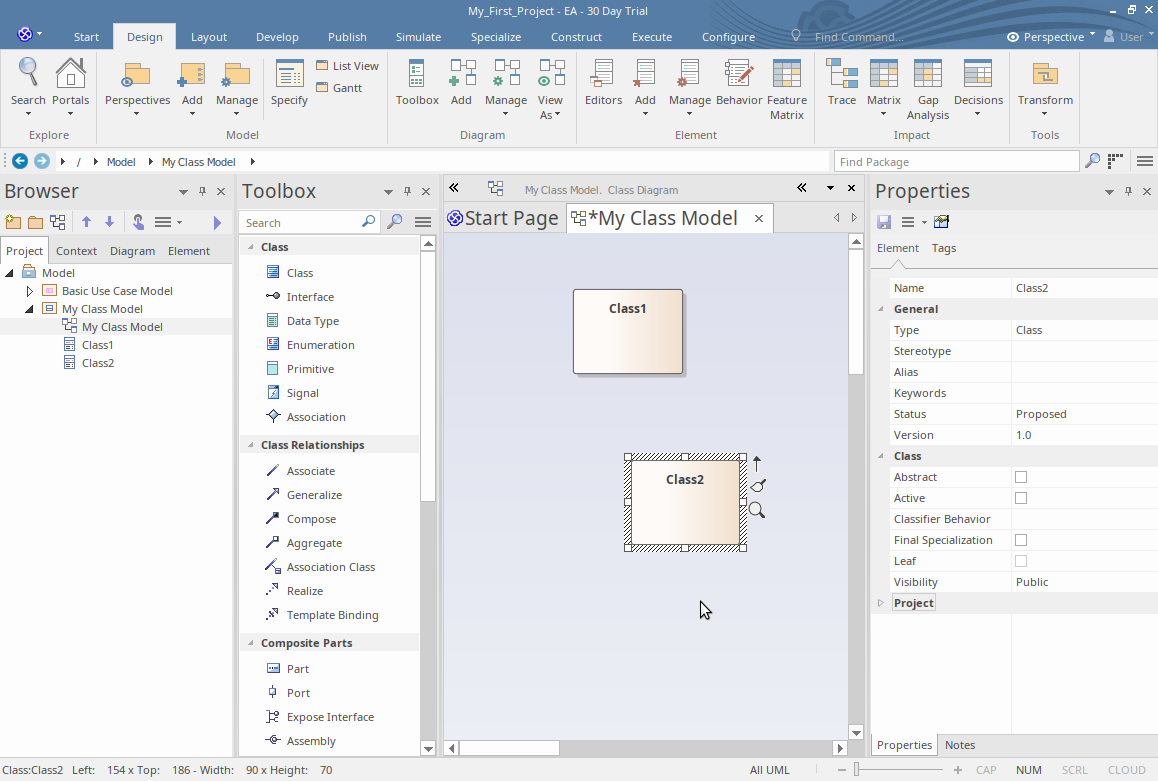 We will now use the Design ribbon to perform some basic modeling tasks, such as creating a new Package and creating a new diagram within the Package, before creating some new elements and connectors on the diagram. In this example, we will create a simple Class model.