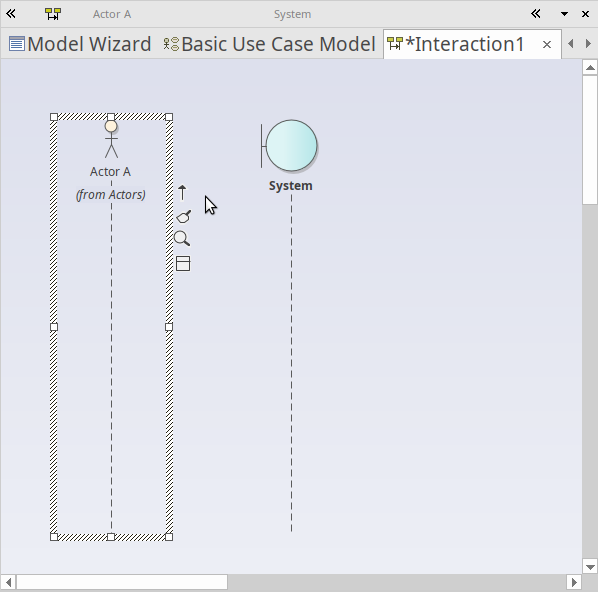A new visual representation of Actor A is now created and placed onto the Sequence diagram as a Lifeline.