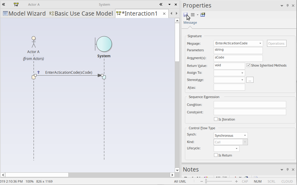 Now, click-and-hold on the Quicklink button, then drag across to the System Lifeline and release. This creates a new message in our model, between Actor A and System. Select the new message on the diagram and note that the Properties window updates to show the properties of the new connector, allowing you to edit the details. After entering a few details for the message and clicking the , your diagram workspace should resemble this image:
