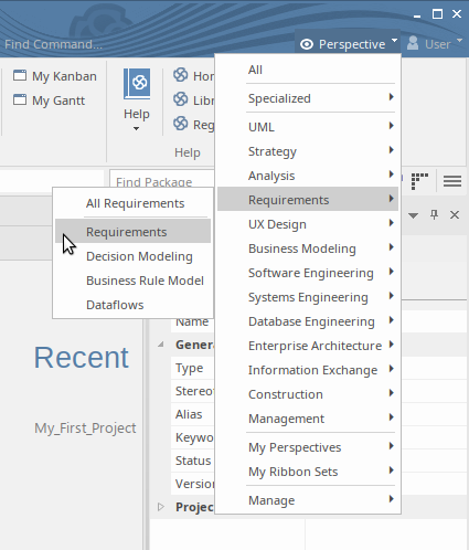 We will now build a simple Requirements Model in our project. Firstly, let's select one of the Requirements Perspectives. From the Perspectives menu, choose 'Requirements | Requirements'.