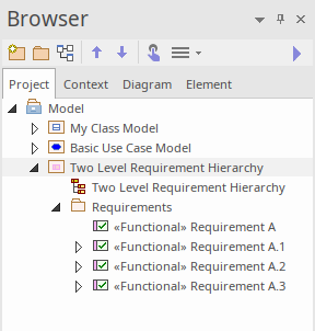 As you can see, there is an underlying model-level element in the Browser window that has a graphical representation in a diagram. Note that you can place a single model element in as many diagrams as you like, and that changing the name or notes or other element properties will be reflected immediately in all diagrams in which the element has been placed.
