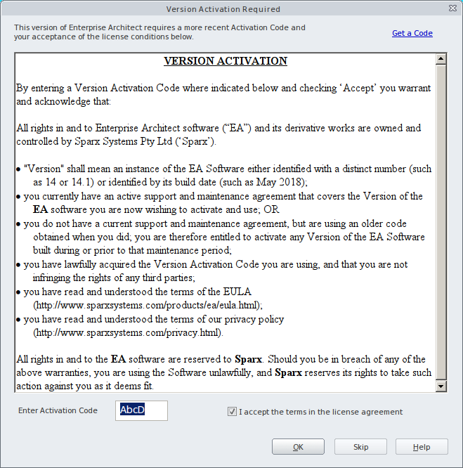 • New versions of the software released after the expiry of your support and maintenance agreement will require a new Activation Code; when you renew your support and maintenance agreement you will be entitled to download newer versions of Enterprise Architect and will be given a new Version Activation Code