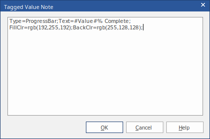 In the Tagged Values Notes, we specify 'Type=ProgressBar;' along with display text and color settings.